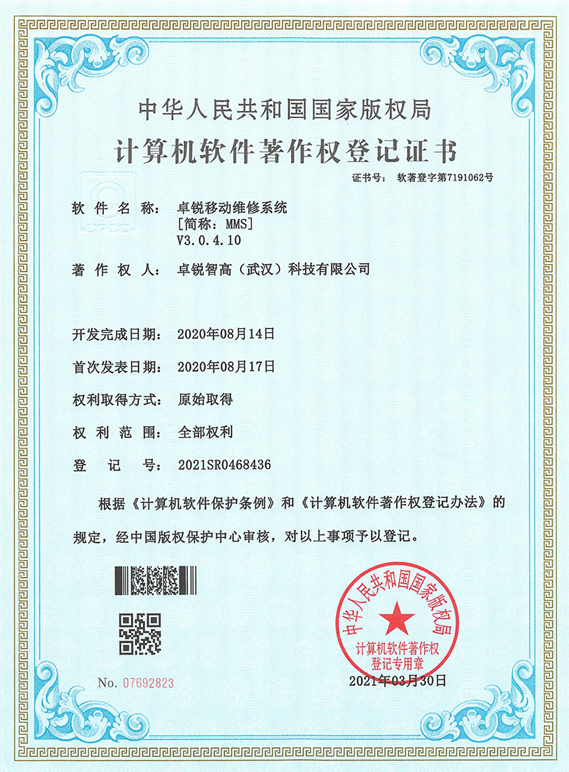 计算机软件著作权登记证书 – 卓锐移动安检系统V3.0.4.7 中华人民共和国国家版权局