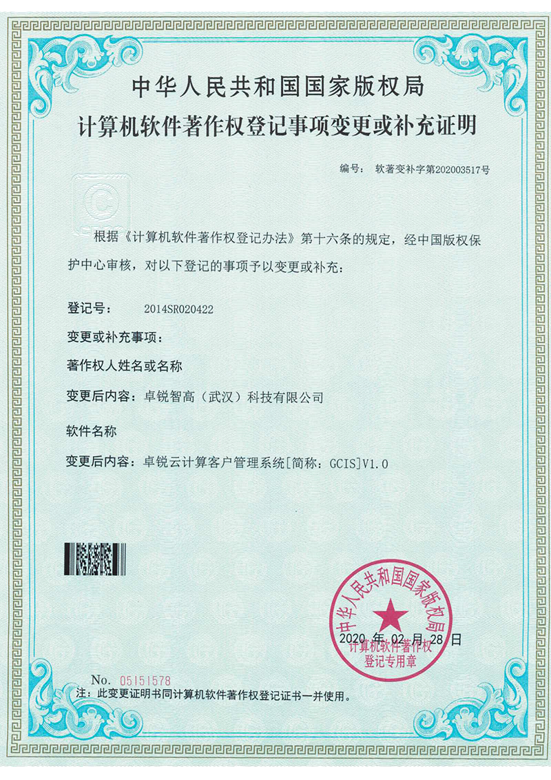 计算机软件著作权登记证书 – 卓锐云计算客户管理系统 中华人民共和国国家版权局